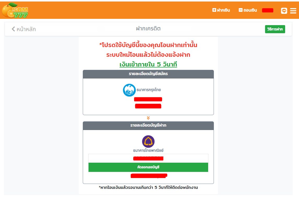ระบบจะแสดงหน้าจอแจ้งว่าให้โอนเงินจากเลขที่บัญชีของเรา ไปยังบัญชีของ som777 เมื่อโอนเรียบร้อยแล้วไม่ต้องทำการแจ้งโอนใดๆ ระบบจะรู้เองว่ายอดนี้ของคุณ